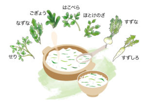 七草粥とは春の七草(せりなずなごぎょうはこべらほとけのざすずなすずしろ)や餅などの具材とする塩味の粥で、その年の1年の無病息災を願って1月7日に食べる粥になります。