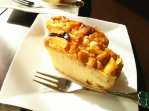 カシューナッツ、くるみ、アーモンドスライスなどの木の実がたくさんでキャラメルコーティングが食欲をそそり、ボリューム満点、食べ応えがありそうなケーキだなと思ったのが第一印象でした。
