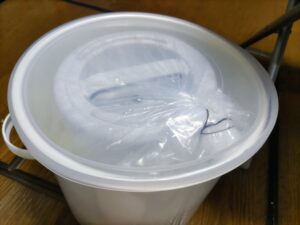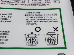 本やネット情報では蓋は紙などに穴をあけて梅酢が上がるまで待つと書かれている時もありますが、私は朝と夜の2回袋を開けて梅を袋の上から軽く揉んで空気を出しています。