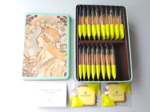 「ラング・ド・シャ・シトロン」は上質なバターを使い、レモンをきかせた繊細な食感のラング・ド・シャのホワイトチョコレートがサンドしてあります。
