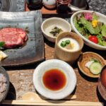 御膳にはサラダや手作り豆腐、小鉢、味噌汁、漬物、さらにデザートまで揃い、彩り豊かで栄養バランスも抜群。ご飯は白米か十六穀米を選べるので、この日は十六穀米をチョイス。プチプチとした食感が和牛の旨みと相性抜群でした。