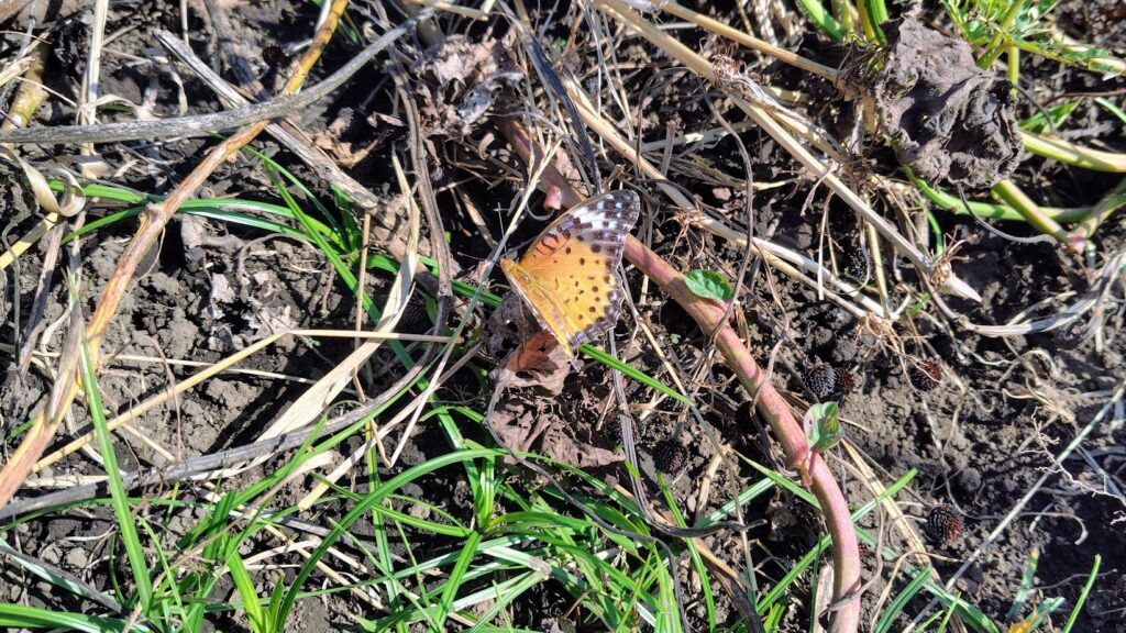 今年の11月の畑では、ナスやゴーヤなどの夏の名残がまだ見られ、蝶やバッタ、ハチの姿もあちこちにありました。