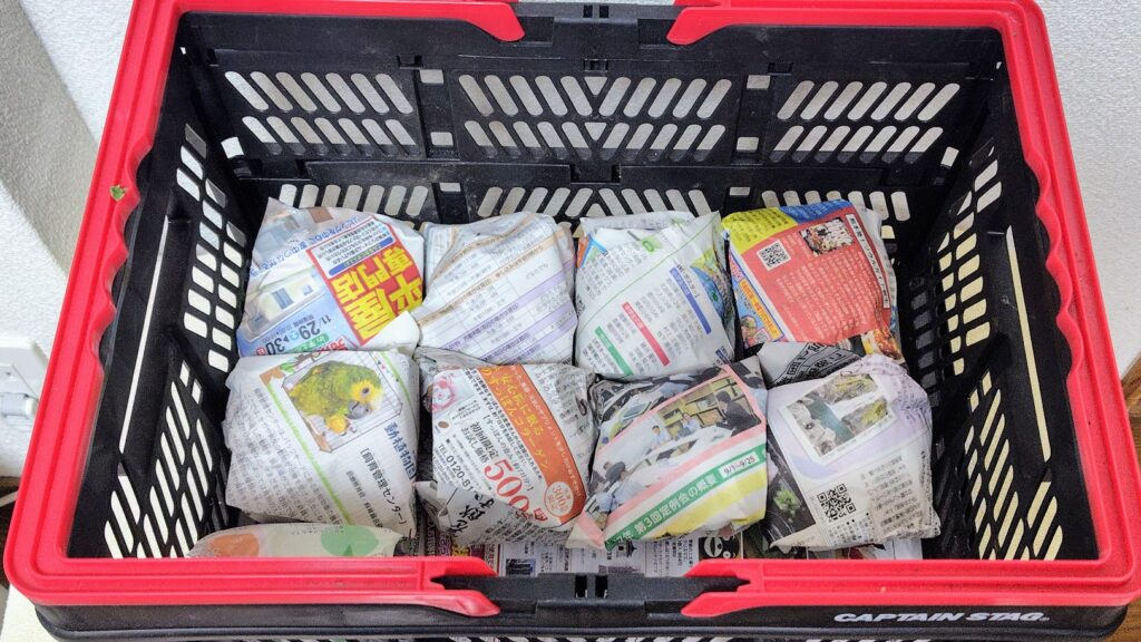 - 新聞紙でくるむ: 柿を一つずつ新聞紙でふんわりと包みます。新聞紙が湿気を適度に保ち、柿が乾燥してシワシワになるのを防いでくれます。