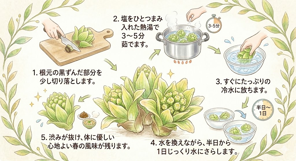 時間をかけてお水にさらすことで、強い渋みが抜け、体に負担をかけない心地よい春の風味だけが残ります。