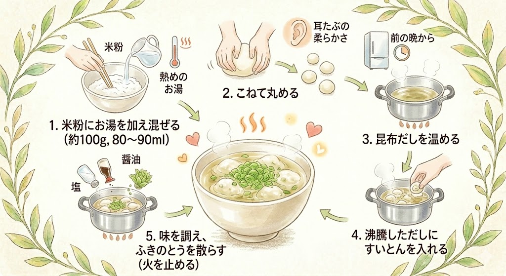 昆布だしと米粉のふきのとうすいとん