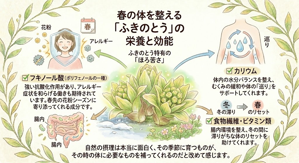 ふきのとうのほろ苦さをひとくち味わうたびに、「今年も春が来た」と体の奥のほうで感じます。忙しい日々の中でも、こうして旬のものを丁寧に下処理して、静かに台所に立つ時間が、自分を整えてくれているような気がしています。