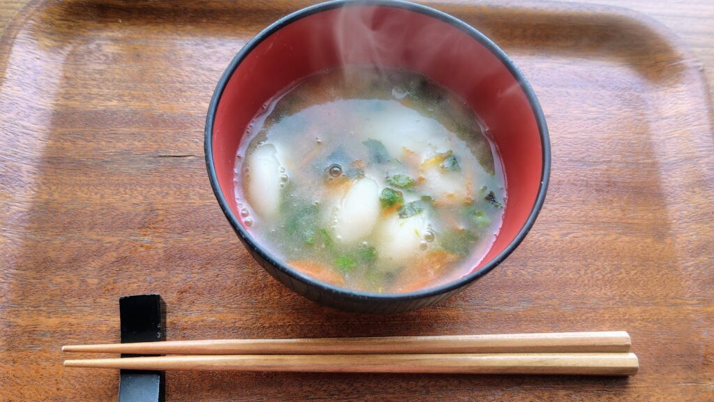 また、昆布だしの中でそのまま米粉のすいとんを茹でると、だしにとろみが出て汁の透明感が少し薄れます。わたしはこのとろみが好きで、米粉の栄養もそのままいただけるのでこの方法で十分でしたが、透明なすまし汁にこだわりたい方は、別のお湯で一度すいとんを茹でてから昆布だしに合わせるとよいと思います。
