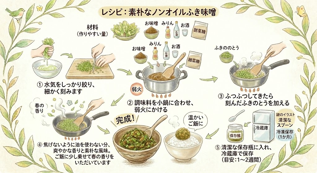 油を使わない分、ふきのとうそのものの爽やかな香りと、お味噌の素朴な風味がストレートに味わえます。温かいご飯に少し乗せて、少しずつ春の香りをいただいています。
