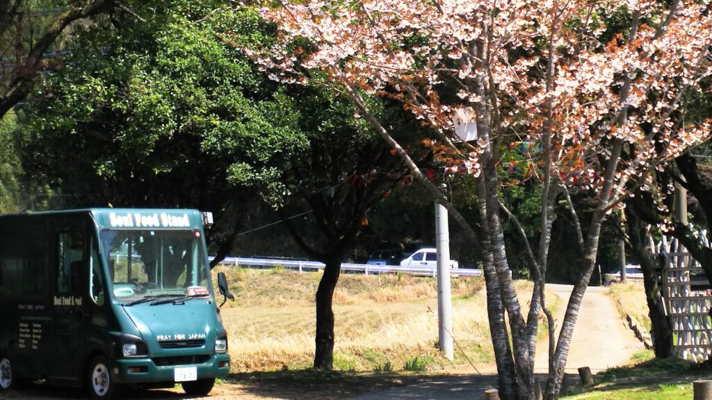 駐車場の片隅には、「PRAY FOR JAPAN」の文字を纏ったキッチンカーが静かに佇んでいました。あの日々を忘れず、前に進んできた証のように、その緑の車体が春の光の中に輝いていました。