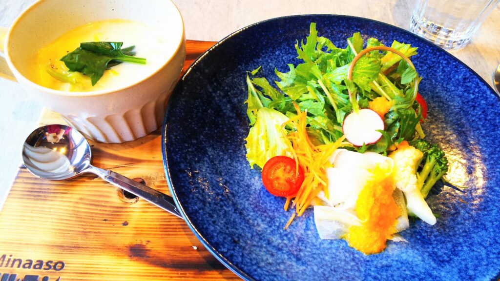 前菜として運ばれた南阿蘇産野菜のサラダは、ラディッシュ、人参、ブロッコリーなど彩り豊か。黄色いポタージュスープとともに、素材の鮮やかさが食欲をそっと引き立ててくれました。