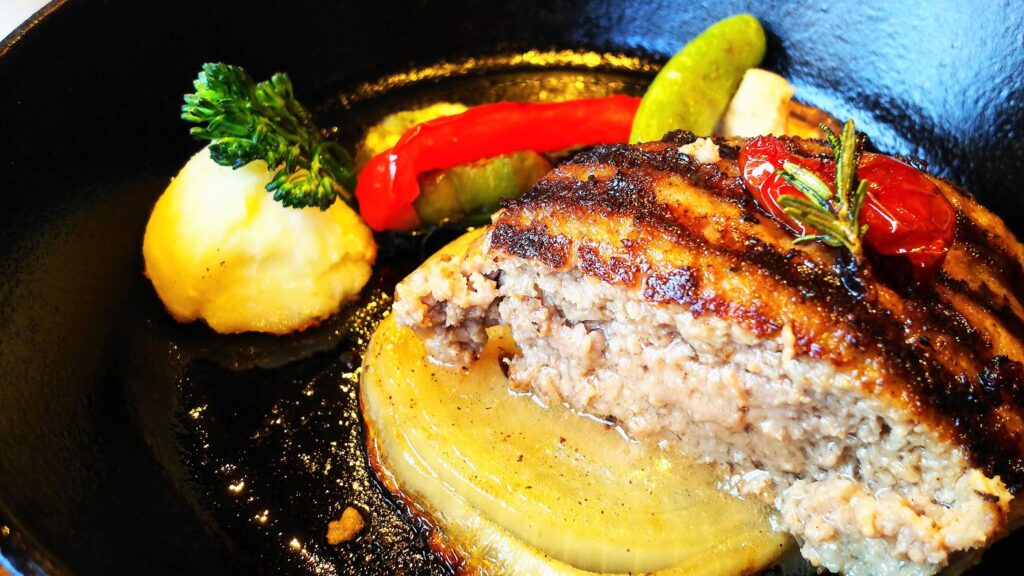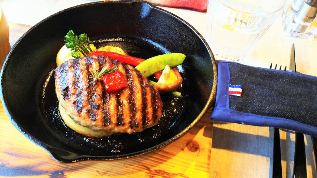 熱々のスキレットで運ばれてきたのは、「阿蘇王」を100%使用したハンバーグ。炭火でじっくり焼き上げられたハンバーグは、お箸を入れると肉汁がじゅわっと溢れます。赤身本来の濃厚な旨みが口いっぱいに広がり、思わず「美味しい…」と声が漏れてしまうほどの幸せでした。