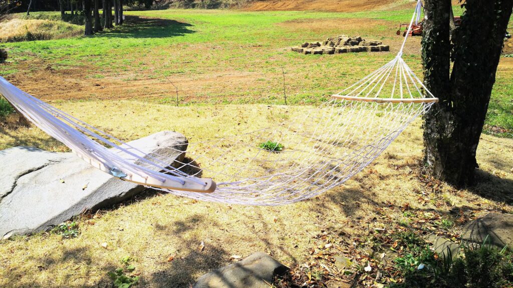お庭にはハンモックが揺れ、木々には可愛らしい鳥の巣箱がそっと置かれていました。澄み切った空気の中で春の風を感じながら過ごす時間は、心がゆっくりほどけていくような心地よさでした。
