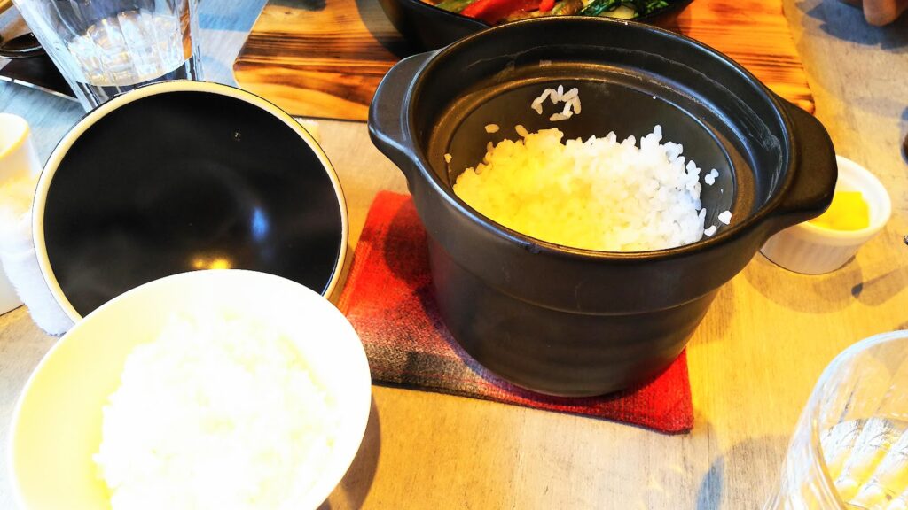 炊き立てのツヤツヤのご飯が土鍋ごと運ばれてくる演出も、食卓をぱっと明るくしてくれます。蓋を開けると湯気が立ち上り、ツヤツヤに炊き上がったご飯の香りが広がります。こういう小さな演出が、食事をより豊かにしてくれるのだと感じました。