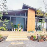 坂を登った先に現れたのは、ダークなスチールフレームと、玄関を飾る温かみのある木のパネルが印象的なモダンな建物。入り口には開店を祝う白い花々が並べられ、まだ若い木々が建物のまわりに静かに根を張っていました。オープンしたばかりのこの場所が、これからゆっくりと育っていくような、そんな清々しさがありました。