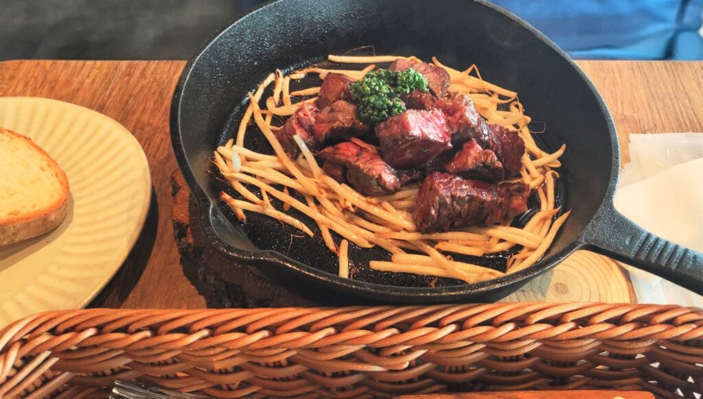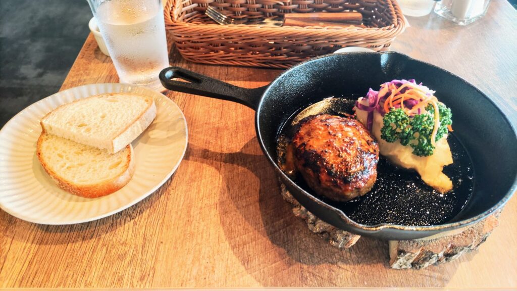 私がいただいたのは、熱々のスキレットで運ばれてくるハンバーグ。表面はしっかり焼き色がついていて、ナイフを入れると肉汁がじゅわりと広がる、丁寧に作られた一皿でした。
