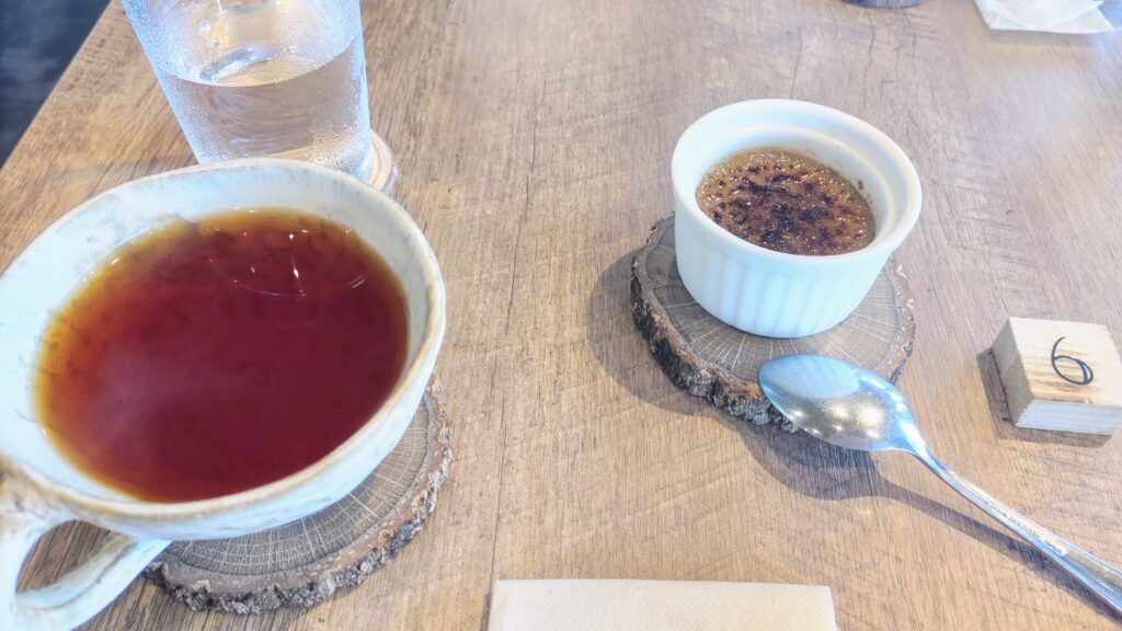 食後に運ばれてきたのは、木のコースターにのせられた小さな白い器のブリュレ。表面はバーナーで丁寧にキャラメリゼされており、スプーンで割ると、なめらかなクリームがゆっくりと顔を出しました。紅茶と一緒にいただく、ゆったりとした甘いひととき。満足感たっぷりの締めくくりでした。