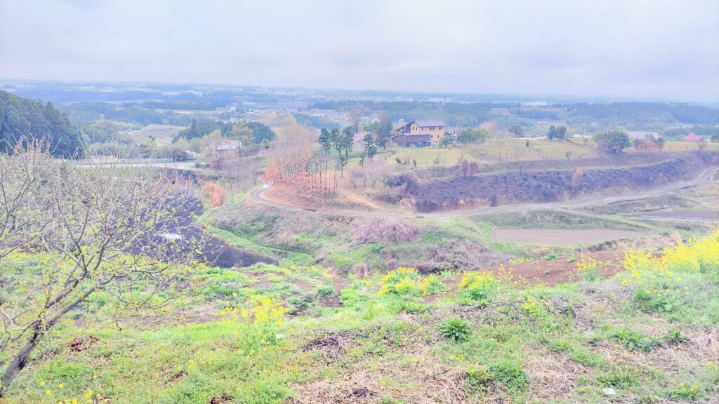 窓の外に広がるのは、西原村の里山の景色。黄色い菜の花が点々と咲き、なだらかな丘がどこまでも続いています。曇り空でも、その広大さと静けさは十分に伝わってきました。晴れた日には、この眺めはいったいどれほど美しいのだろうと、想像せずにはいられませんでした。