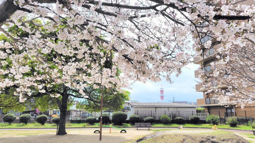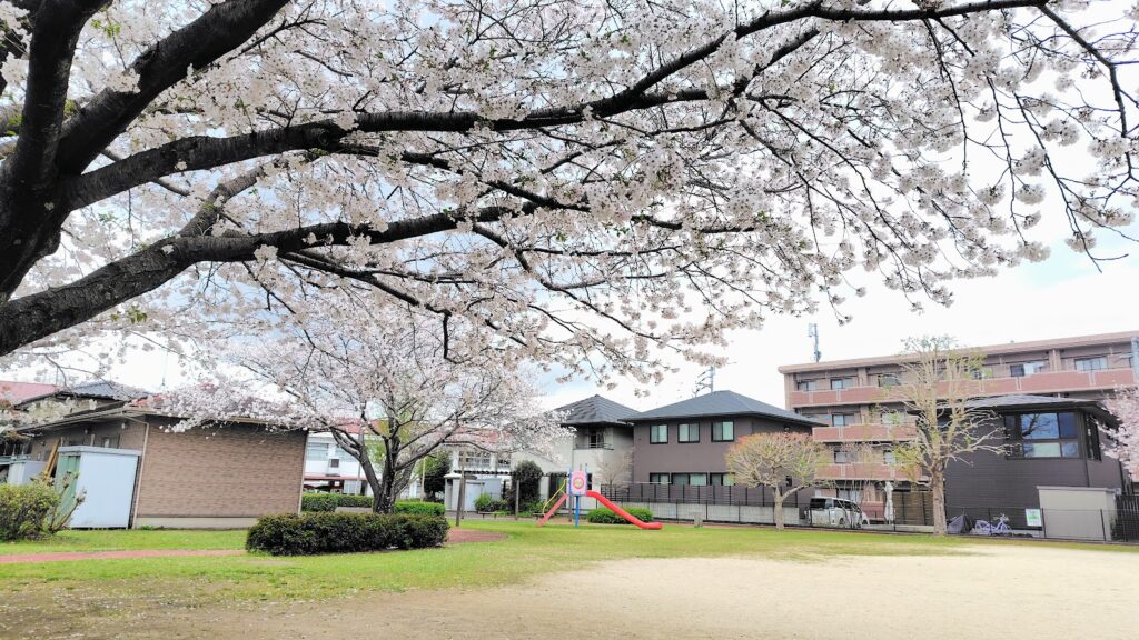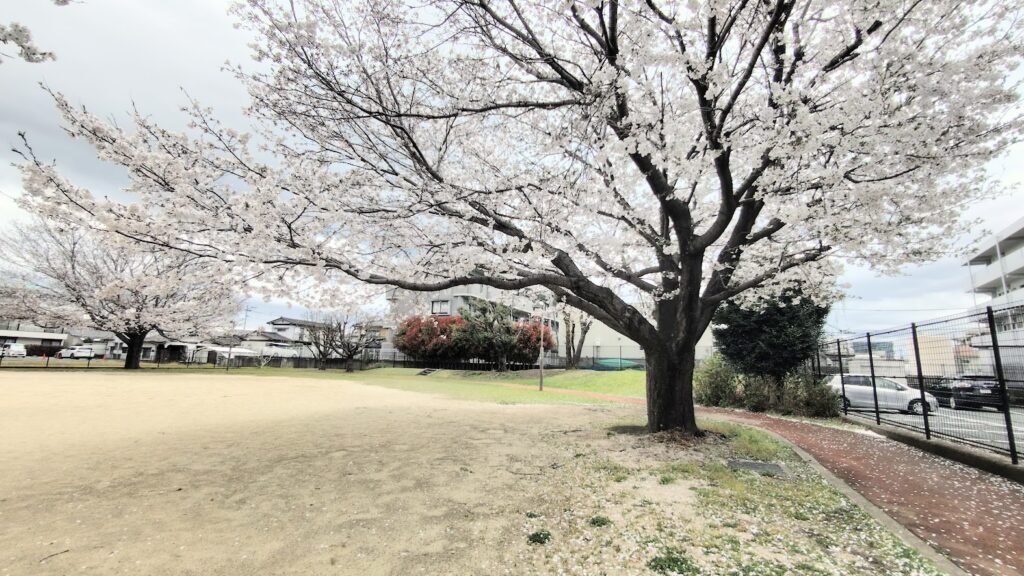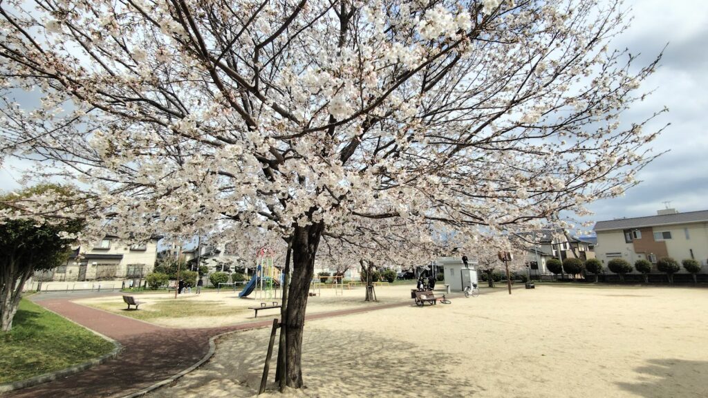 今回は2か所の公園を訪れました。最初の公園はできて10年ほどの場所で、桜は8分咲き。