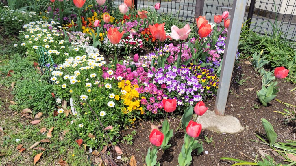 公園の出口には、チューリップやパンジー、マーガレットなど春の花がぎっしりと咲いた花壇があって、思わず立ち止まってしまいました。桜だけでなく、こんなにも色とりどりの花たちに見送ってもらえた気分でした。